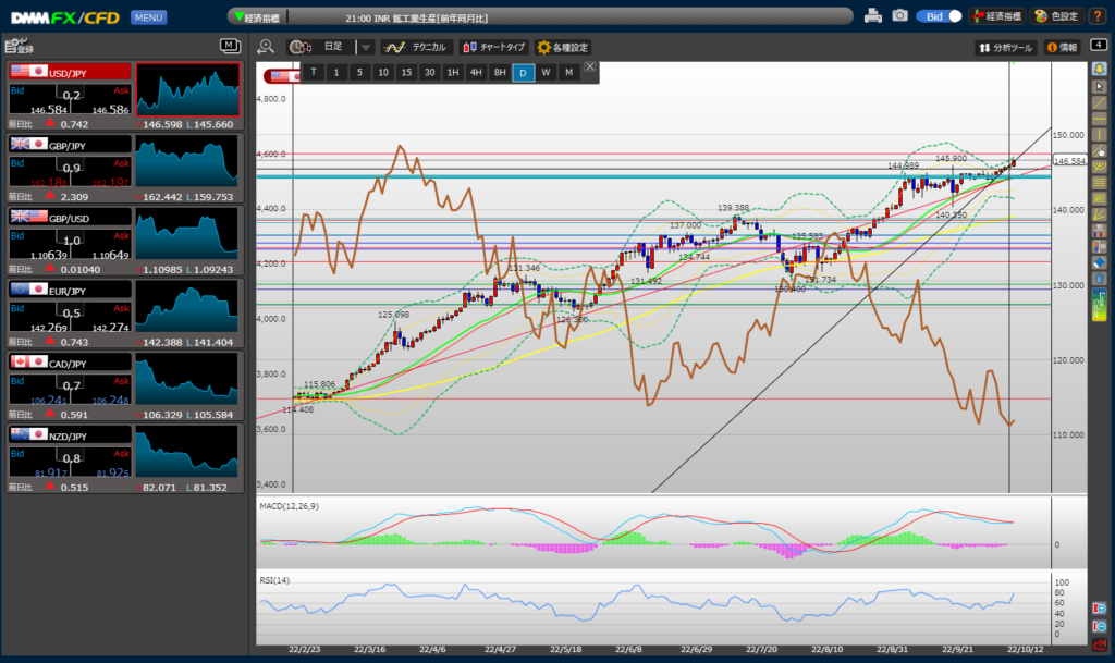 一定期間の値動きの変動幅から、買われ過ぎや売られ過ぎを数値で判断するテクニカル指標です。基本的に変動幅は0~100%の数値によって表示され、70%以上となれば買われすぎ、30%以下となれば売られすぎと判断されます。RSIは通貨別、時期によって癖が出るため、通貨の過去の傾向を把握しておくことが必要です